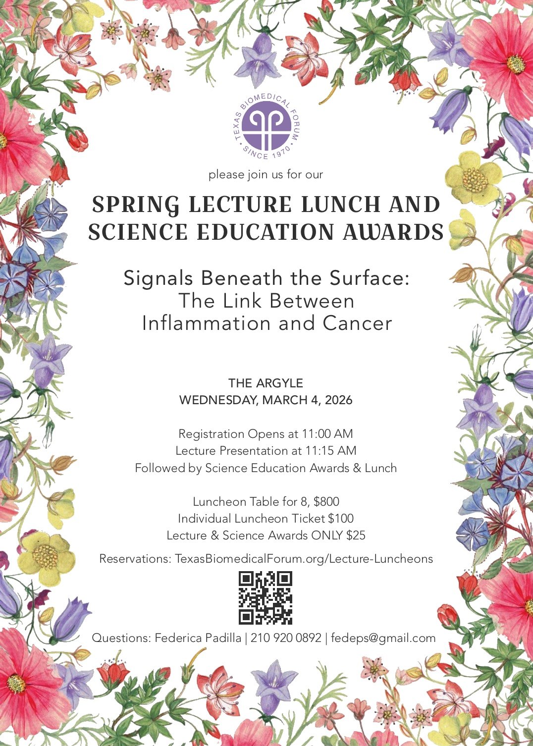 Texas Biomedical Forum is a 501(c)(3) charitable organization; Tax ID No. 23-7080207. Your charitable contribution is reduced by the Cost of Benefit Received for each person included in the table, ticket or sponsorship purchase. This organization does not provide tax advice. Please consult your tax advisor to determine your deduction eligibility. Thank you very much for your support of the Forum! Your valuable contribution provides meaningful support to the ongoing work of the Texas Biomedical Research Institute. We are so appreciative!